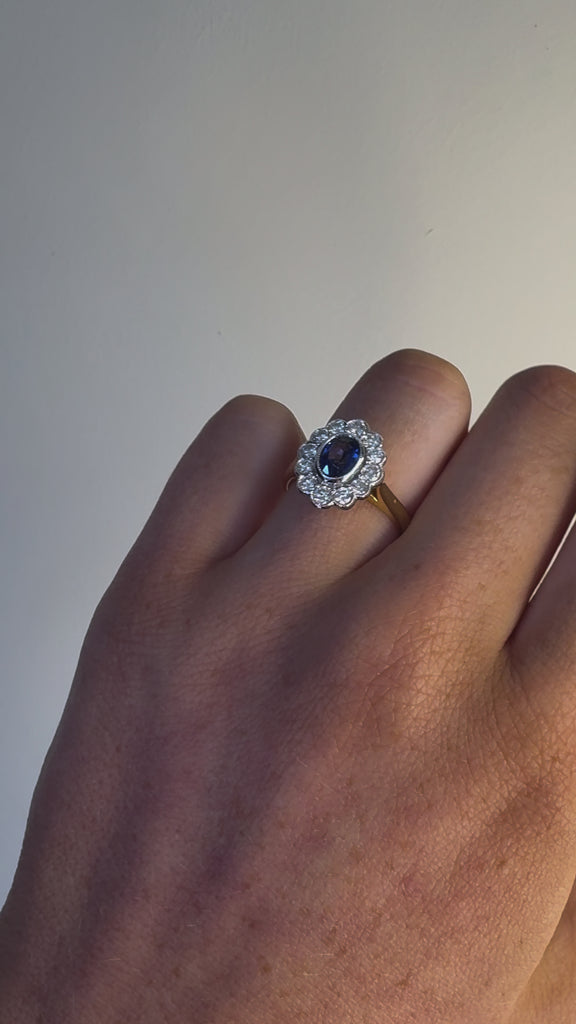 Sapphire Bloom with Diamond Radiance.. This exquisite gold ring centres a rich oval-cut blue sapphire framed by a halo of sparkling diamonds in a floral motif. A breathtaking blend of color and brilliance—perfect for marking elegant occasions with timeless grace.
