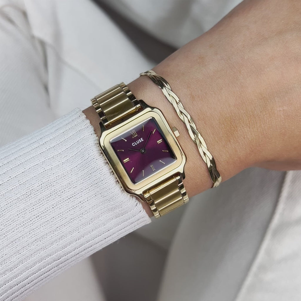 Add a sense of luxury and sophistication to your look with the Gracieuse Petite Watch for women. Featuring a square 24 mm gold colour case, a rich dark cherry colour dial, and 14 mm 3-link stainless steel strap. Easily customize the look of your watch with any 14 mm strap. You can easily adjust the strap size by yourself.