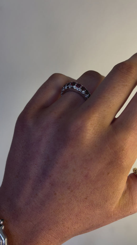 Radiant Rhythm in Ruby and Diamond This striking white gold band showcases alternating rubies and sparkling white diamonds in a sleek channel setting. A bold celebration of passion and grace, this timeless design brings vibrant elegance to every gesture.