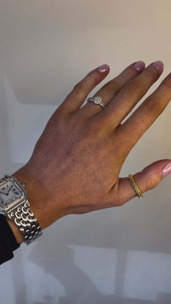 Radiant sophistication: This oval-cut diamond ring features a shimmering halo and a double-row pavé band, combining timeless elegance with modern allure.